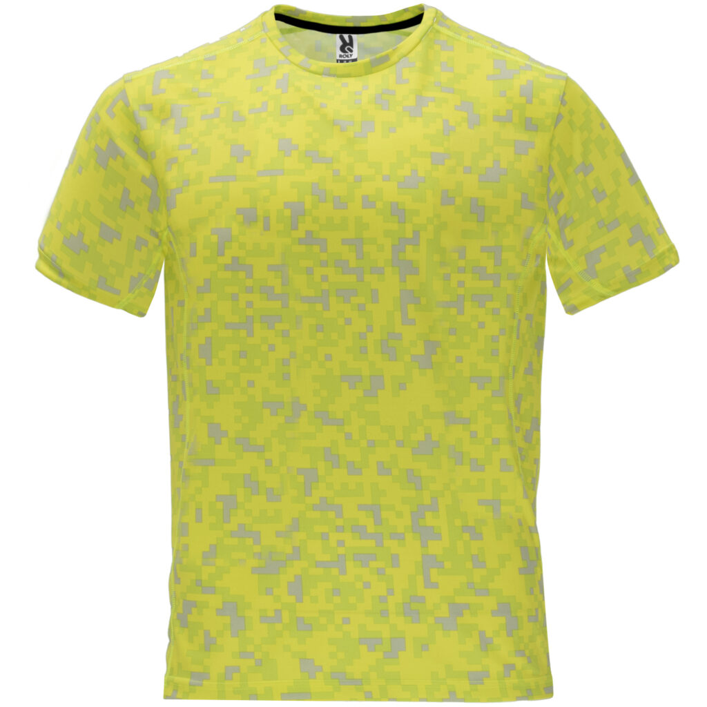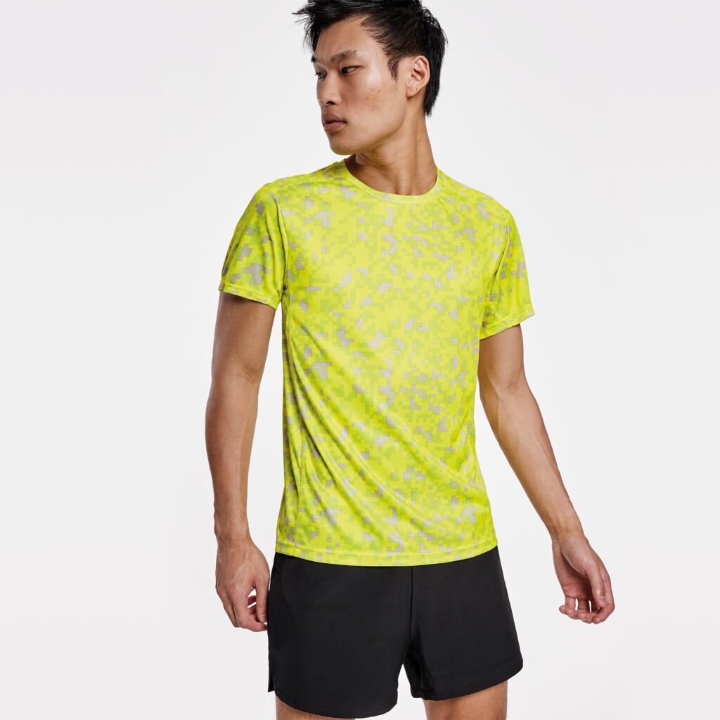 Short sleeve printed technical shirt. Crew neck with reinforced covered seams to contrast in fluor yellow. Side panels on the inside of the sleeve and on the shoulders with overlock to tone.