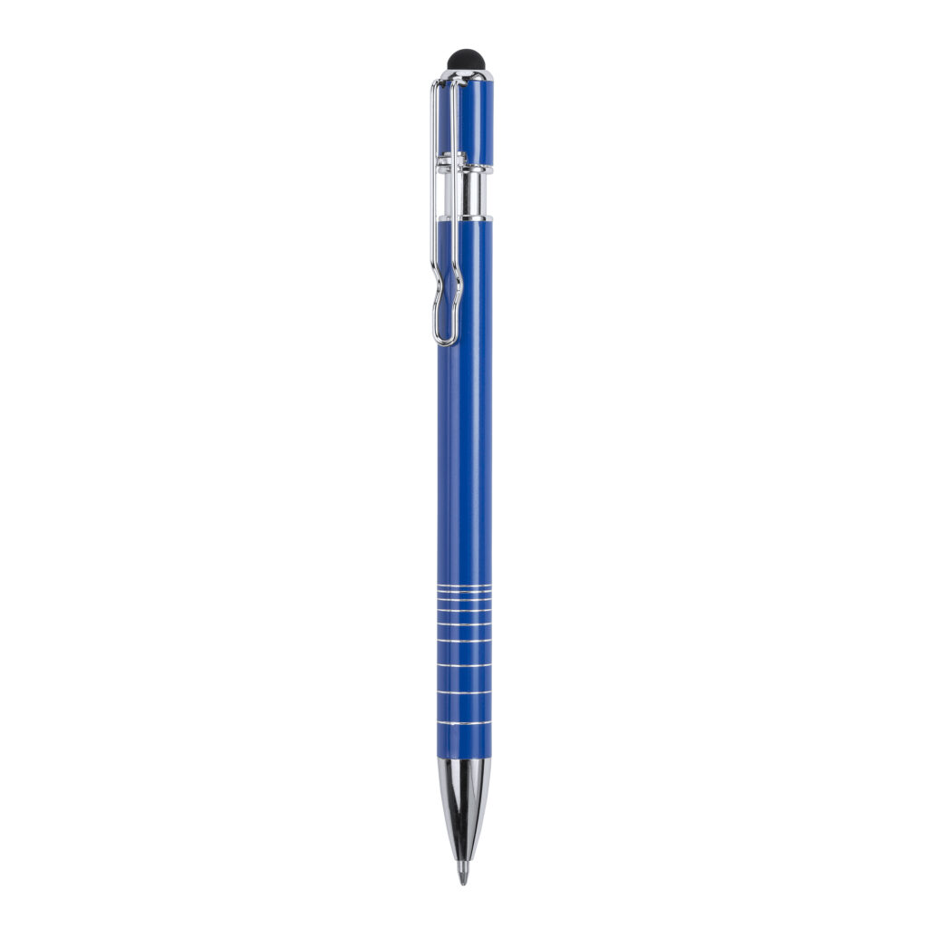 Metallic pen with push button. Touch pointer and design clip. Jumbo refill in blue ink.