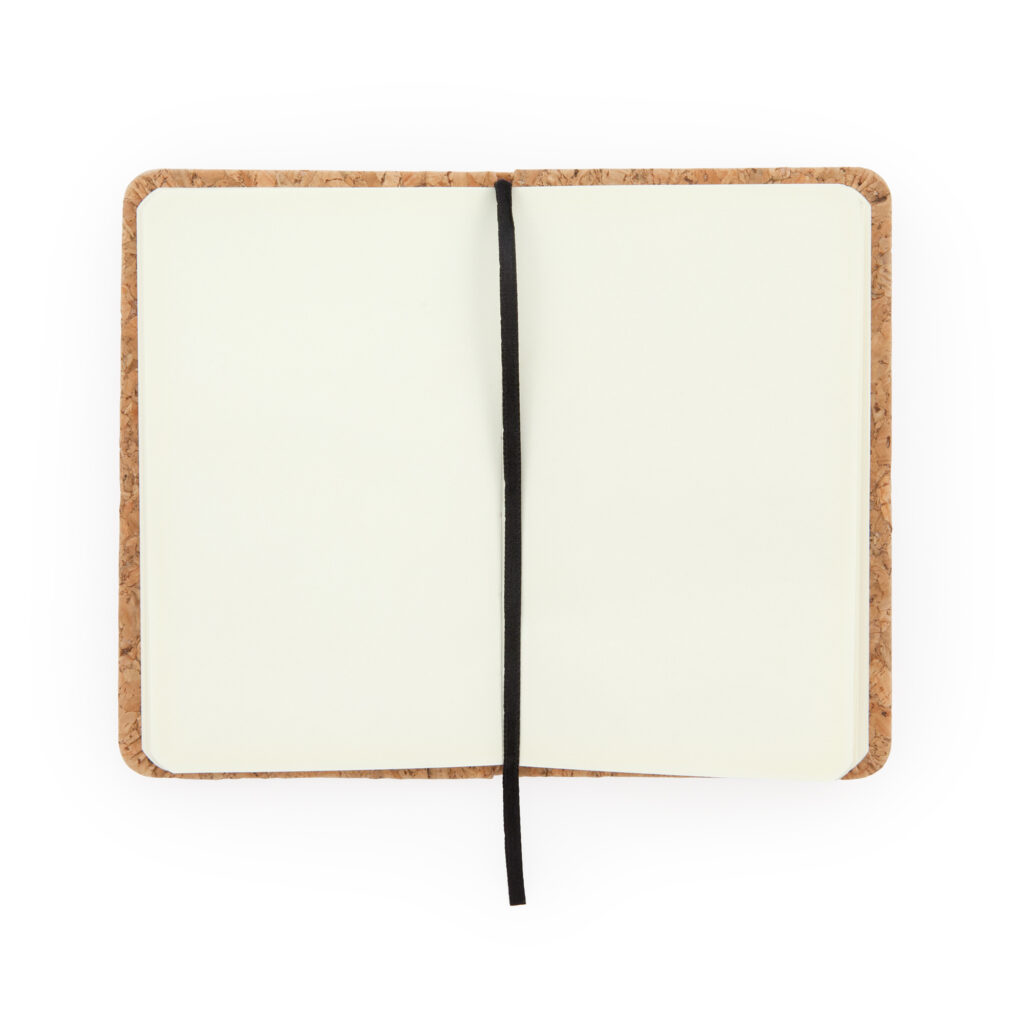 A6 Notepad. Rigid natural cork covers. Bookmark and elastic band. 80 sheets.