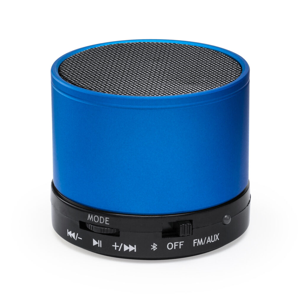 Wireless speaker with metallic body in matt finish. Bluetooth 3.0 FM radio and hands-free function. Power 3W. Rechargeable battery. Cable included. Presented in designed box.