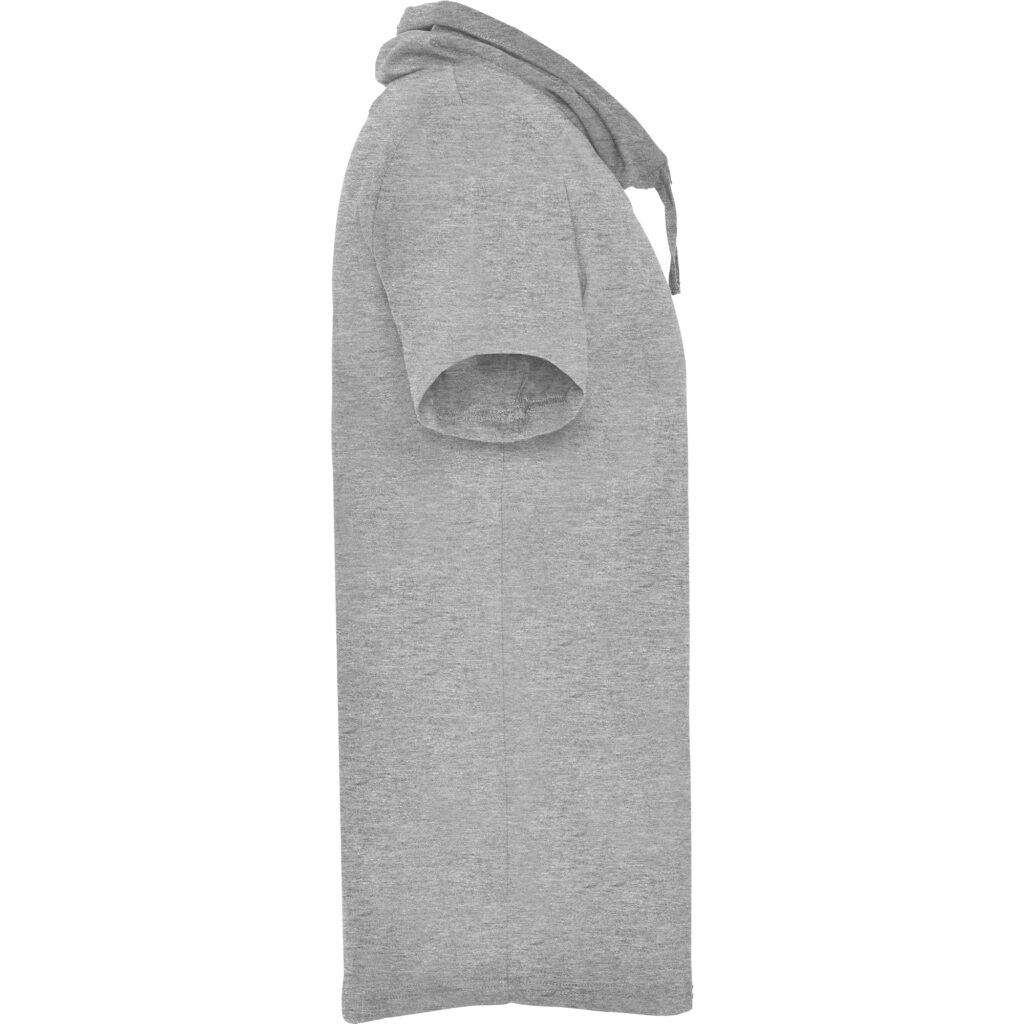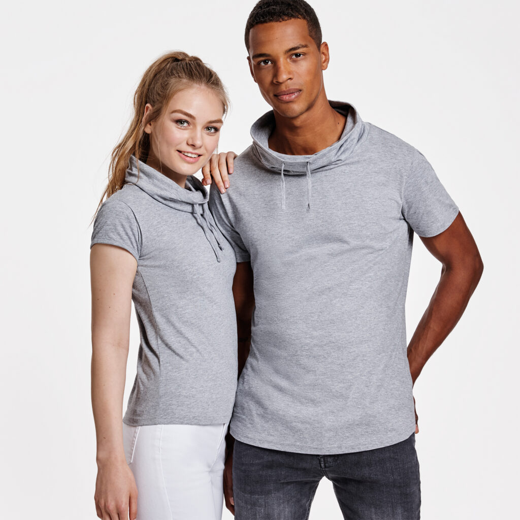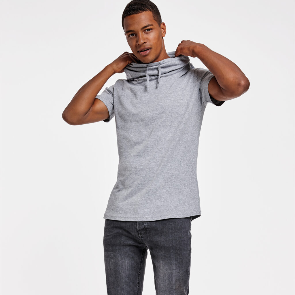 Short sleeve t-shirt and a funnel neck with adjustable cord. Side seam.