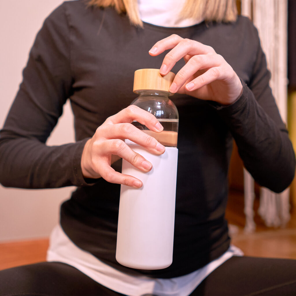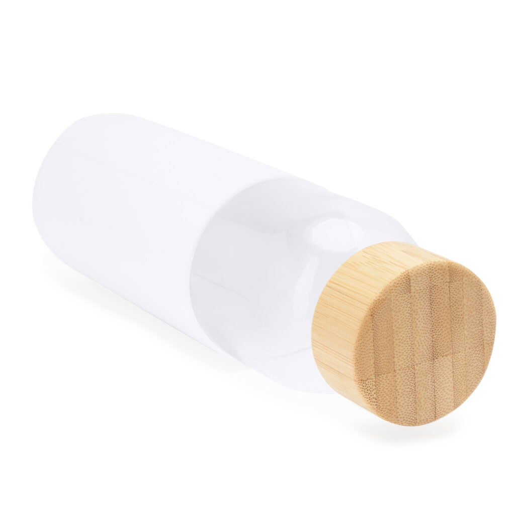Glass bottle with bamboo cap and colour silicone pouch. 540 ml capacity.