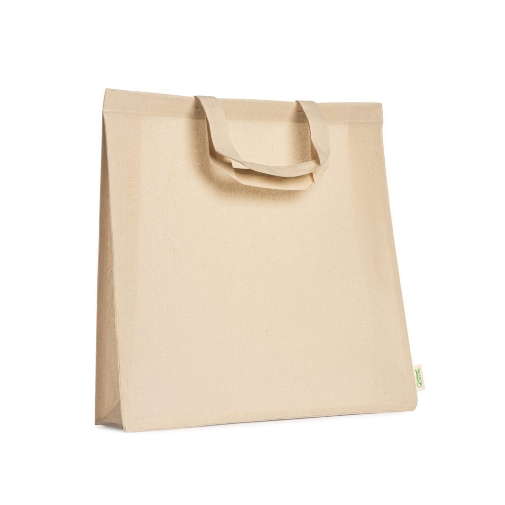 100% 120 gsm organic cotton bag with gusset and reinforced 35 cm short handles.