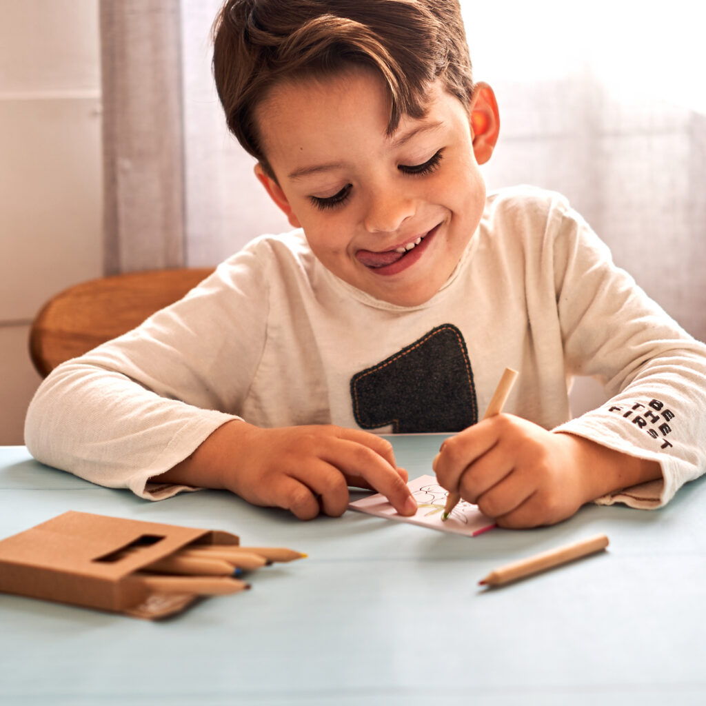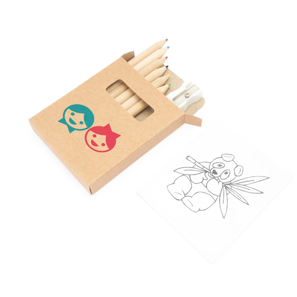 Drawing set for kids. Pad with drawings, 6 colour pencils and a sharpener included. Presentation in a recycled cardboard box.